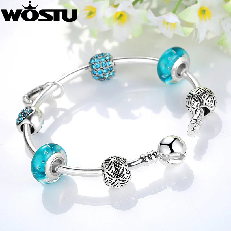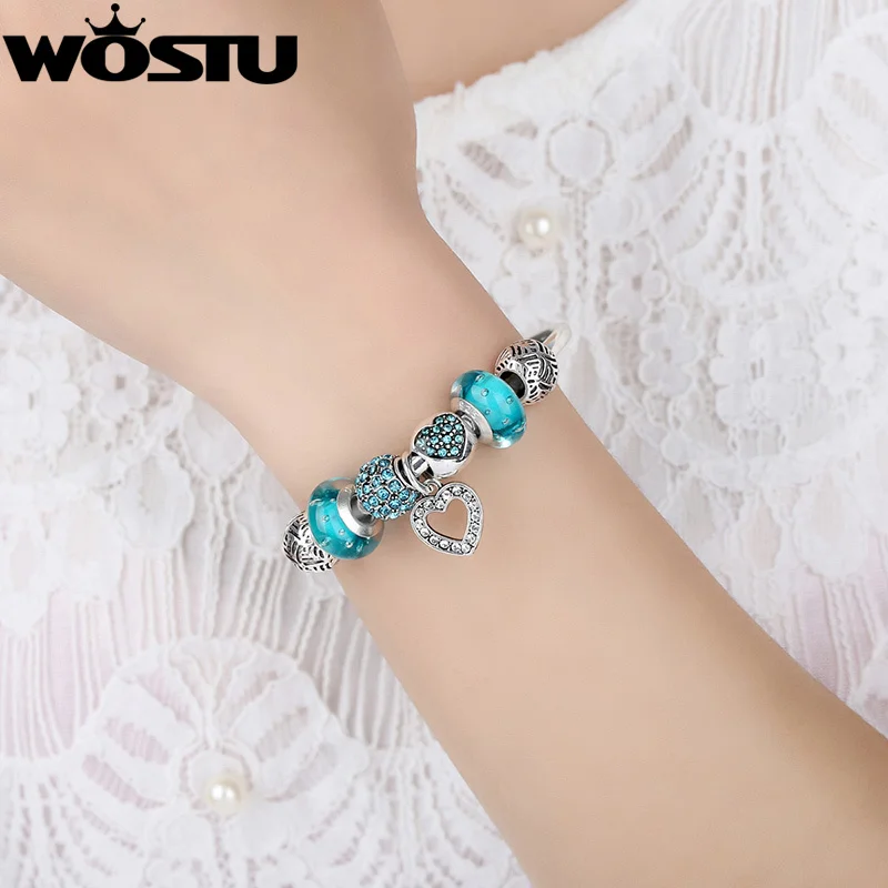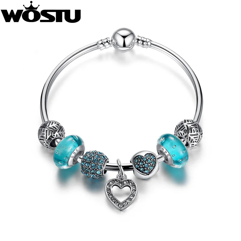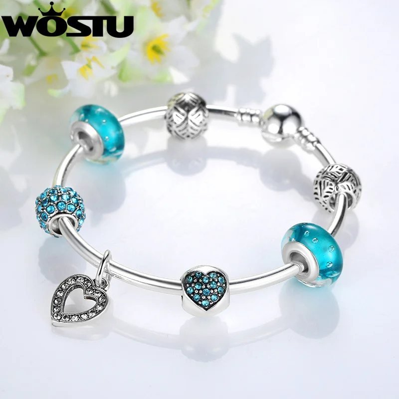 Buy Hot Sale Silver Blue Heart Charm Bangle For Women Fashion Original DIY Beads Fit Brand Bracelet Jew