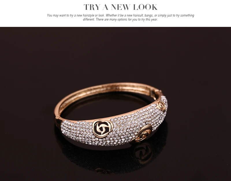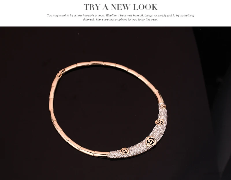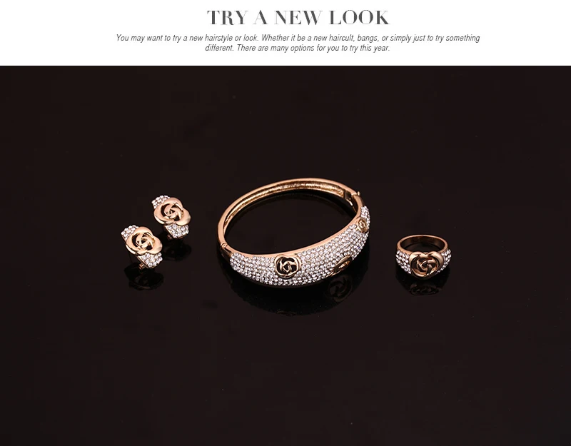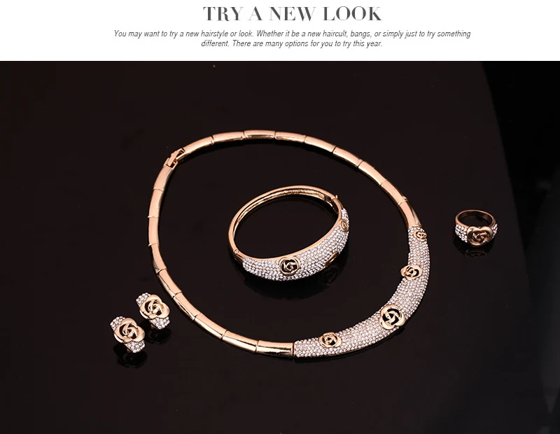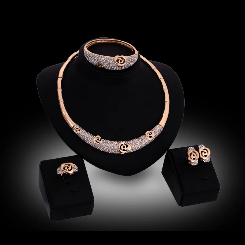 New Fashion Wedding Jewelry Set Gold Color Full Rhinestone Necklace Bangle Ring Earrings Party Set
