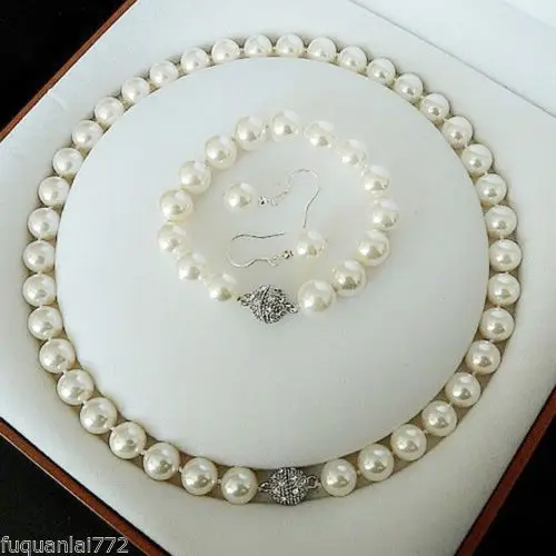 New natural pearl jewelry RARE 10MM SOUTH WHITE SEA SHELL PEARL NECKLACE BRACELET EARRINGS Bridal silve