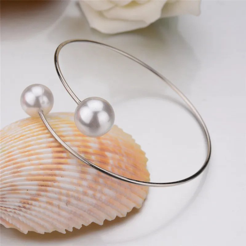 Buy New Wedding Jewelry Gold/Silver Plated Open Cuff Bracelets Simple Double Simulated Pearl Ball Bead