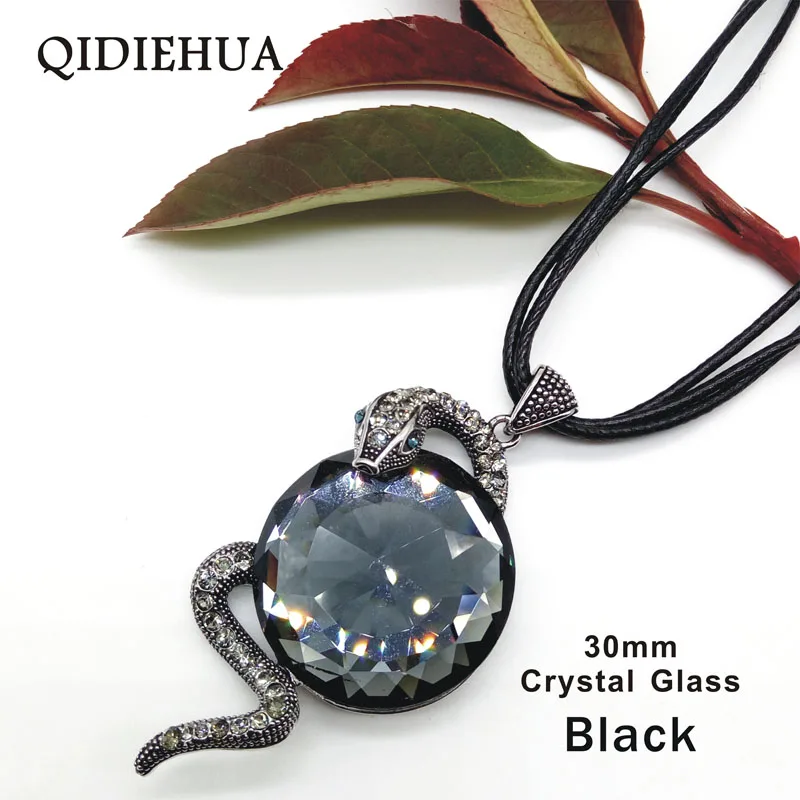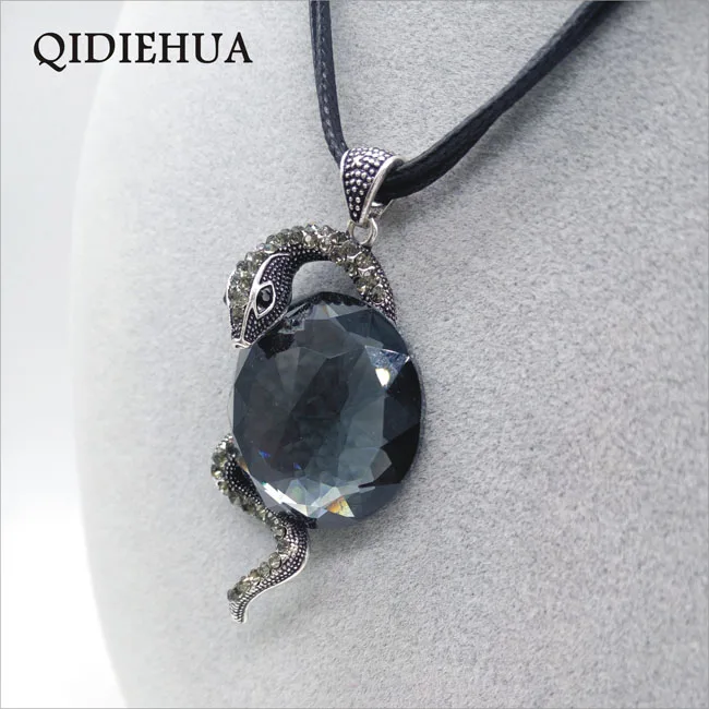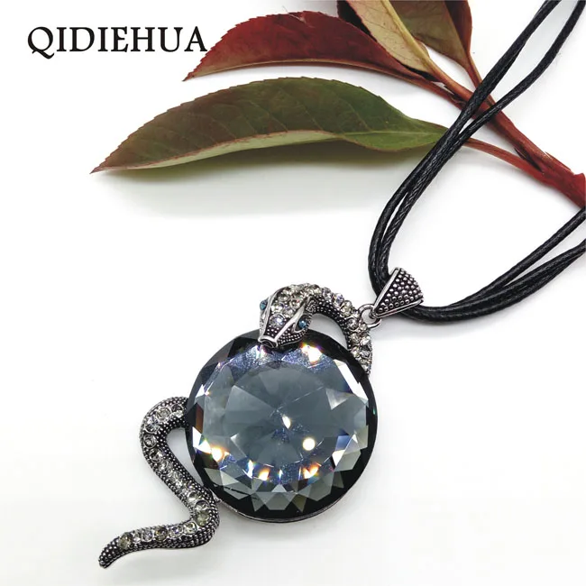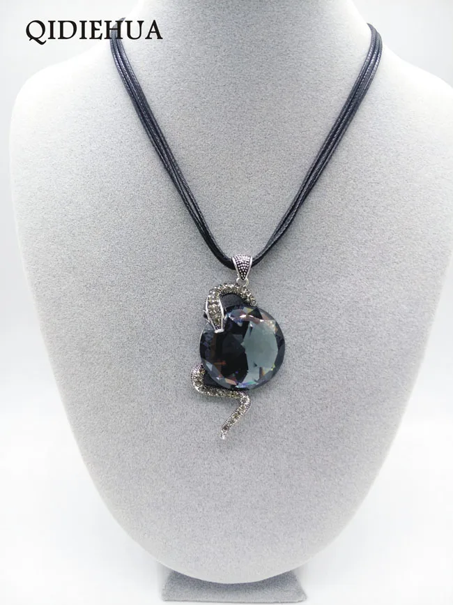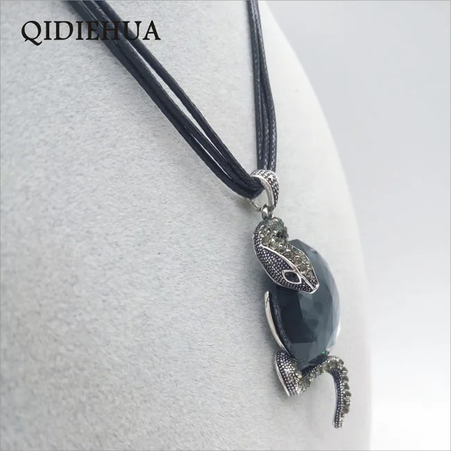 Promo QIDIEHUA Fashion Antique Silver Snake Pendant Necklace Woman Black Rope Choker Jewelry Shiny Glass