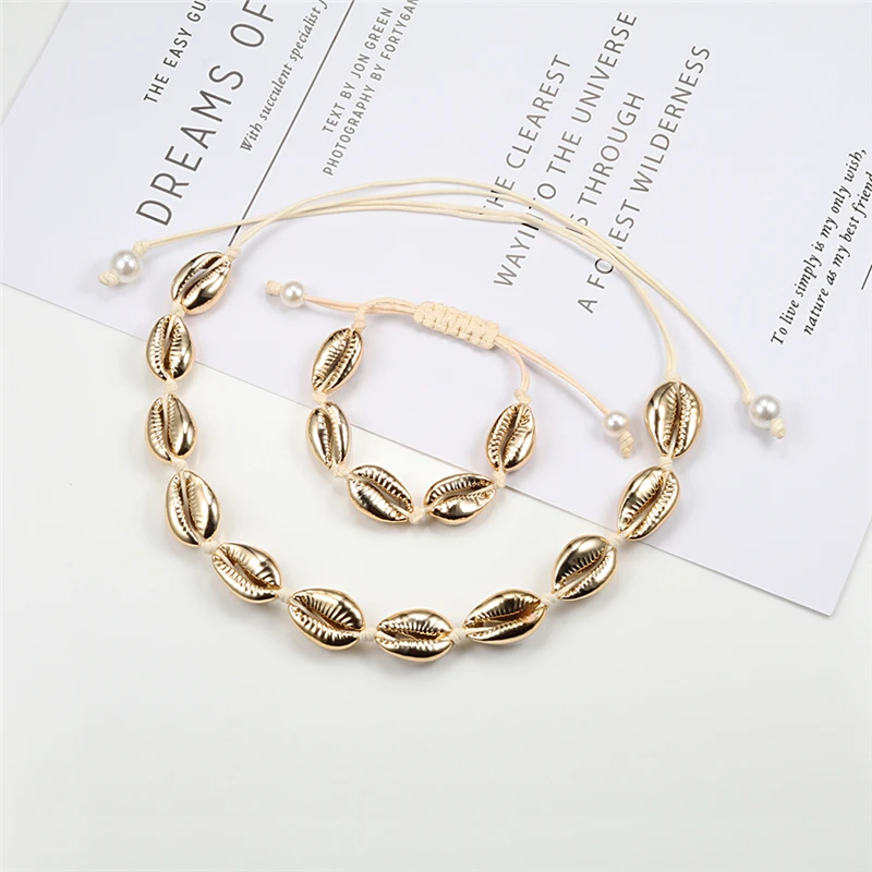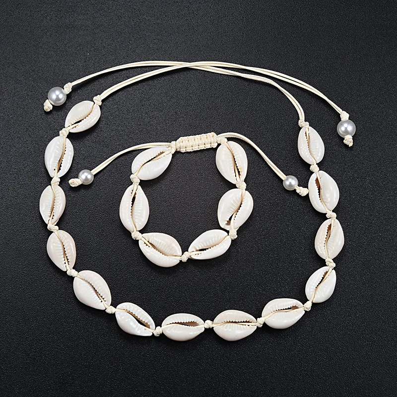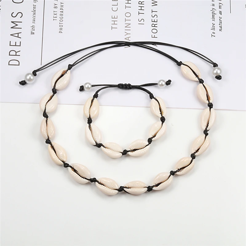 Promo Black Rope Chain Puka Shell Necklace Bracelet Set Boho Seashell Cowrie Collar Choker Woman Hawaii S